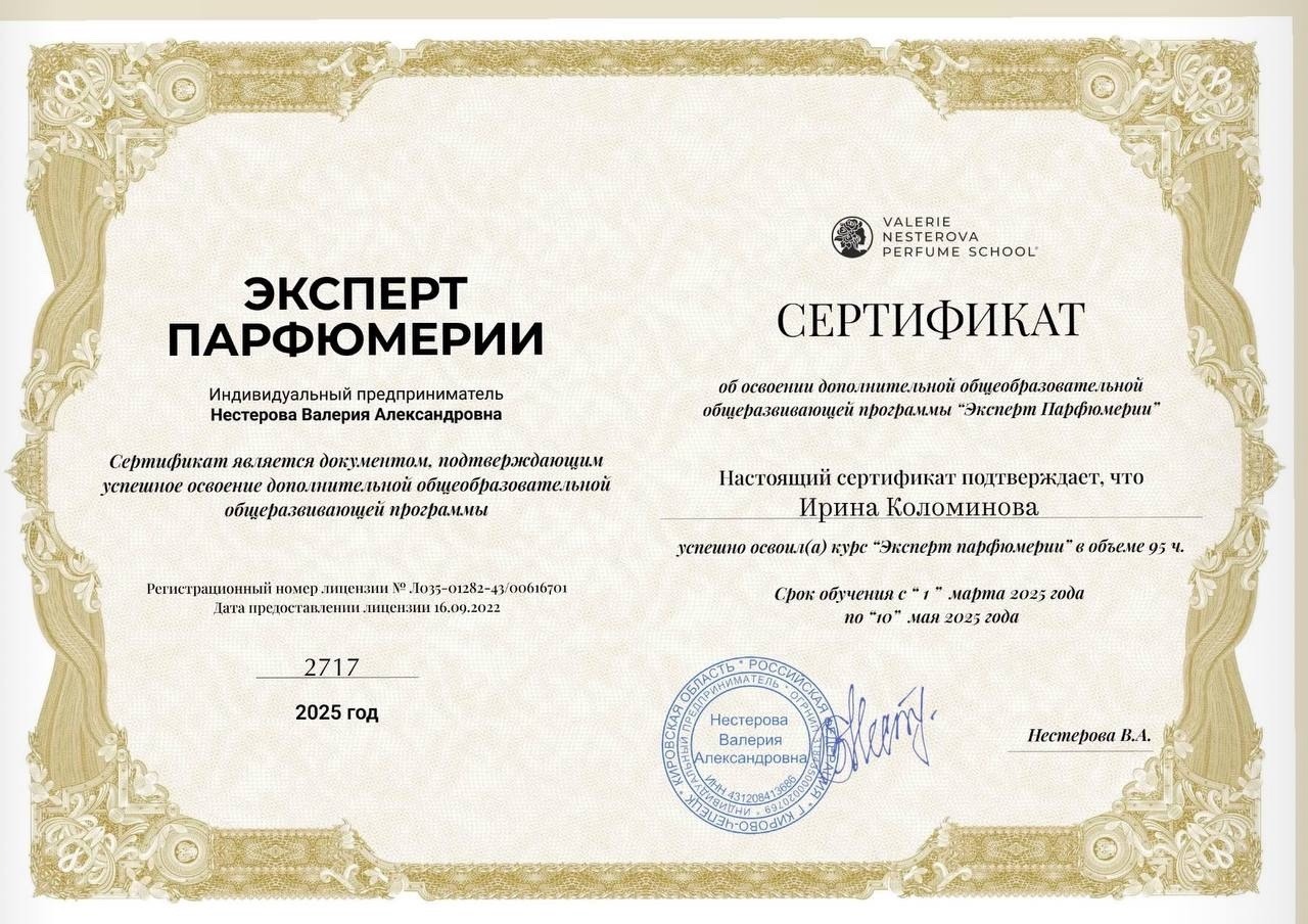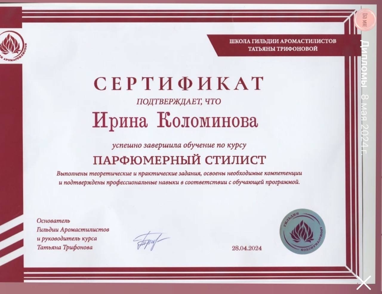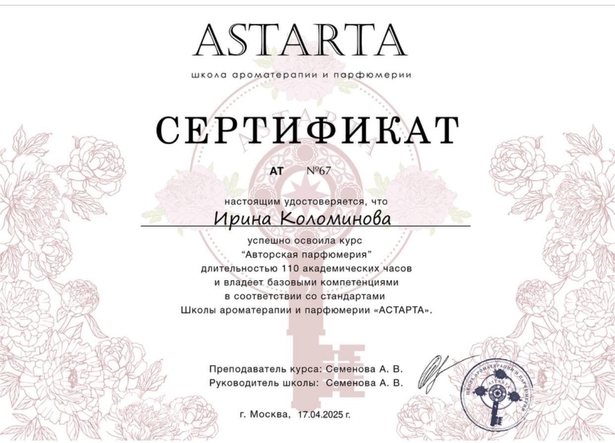 В 2024 г. прошла обучение «Аромастилист» у Татьяны Трифоновой.