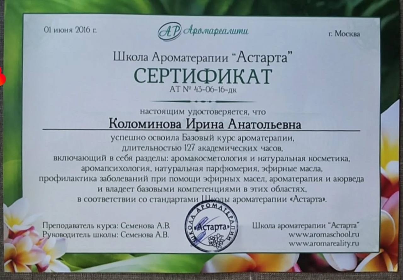 В 2016 г. закончила годовой курс "Ароматерапии" в школе «Астарта» у Анны Семеновой.